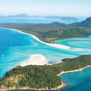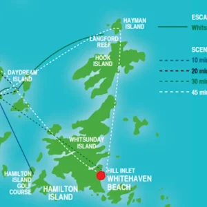 Fly over pristine Whitehaven Beach and the famous swirling sands of Hill Inlet