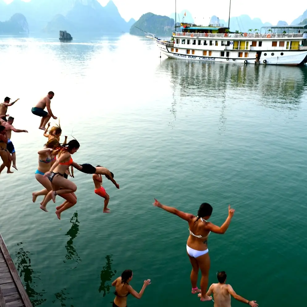 Experience the stunning natural wonder of Ha Long Bay, cruise on beautiful emerald green waters through towering limestone mountains topped with rainforest. Go kayaking through caves and enjoy some drinks aboard our overnight boat!